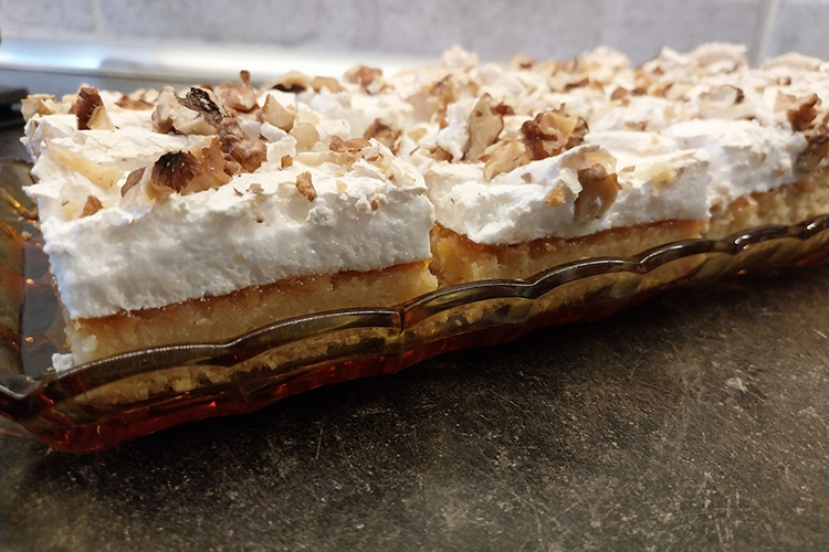 Ovaj kolač se sastoji od tri sloja: mekanog testa, voćnog fila i penaste belanac-kore sa orasima, što ga čini savršenim za porodična okupljanja ili posluženje uz kafu.