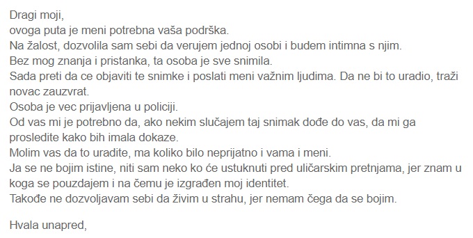 Ona se, naime, našla u velikom problemu sa kojim se suočava veliki broj žena pojavom društvenih mreža i interneta, a to je da je bivši partner ucenjuje intimnim snimcima.
