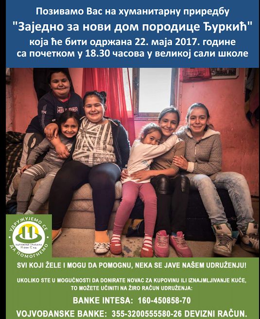 U ponedeljak, 22. maja, Udruženje građana “Novi Sad” i OŠ “Žarko Zrenjanin” organizuju dečiju humanitarnu priredbu “Zajedno za novi dom porodice Đurkić”. koja će biti održana u velikoj sali škole.