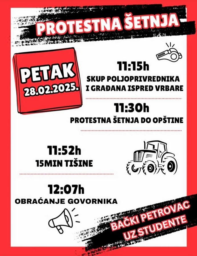 U Bačkom Petrovcu svaki dan ispred Gimnazije “Jan Kolar” đaci i profesori stoje 15 minuta, a utorkom i petkom se isto organizuje i 15 minuta tišine i blokada raskrsnice u Petrovcu.