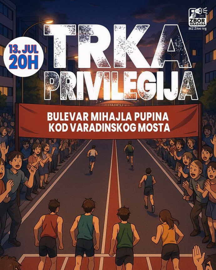 U nedelju, 13. jula s početkom u 20 časova, kod Varadinskog mosta, Zbor Mesne zajednice “Žitni trg”, uz podršku ostalih zborova, organizuje društveni performans pod nazivom “Trka privilegija”.