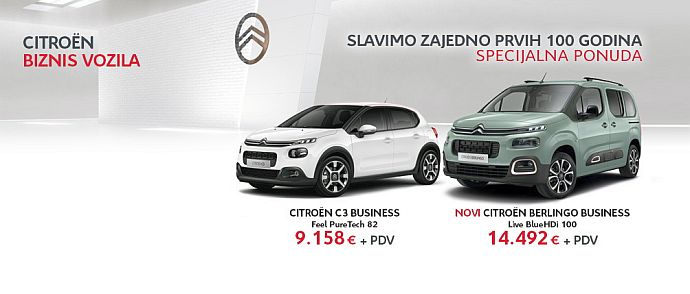 Povodom sto godina postojanja brenda Citroen, ova kompanija pripremila je velik broj različitih akcija i pogodnosti. Svi zainteresovani mogu da posete “Gota Car Group” na Zrenjaninskom putu 6, koji je zvanični prodavac i serviser ovih vozila, te da lično pogledaju modele iz komercijalnog programa u koji spada i specijalna Business serija. U pitanju su N1 teretna vozila C3 Business i Berlingo Business, za koja postoje specijalne ponude finansiranja.