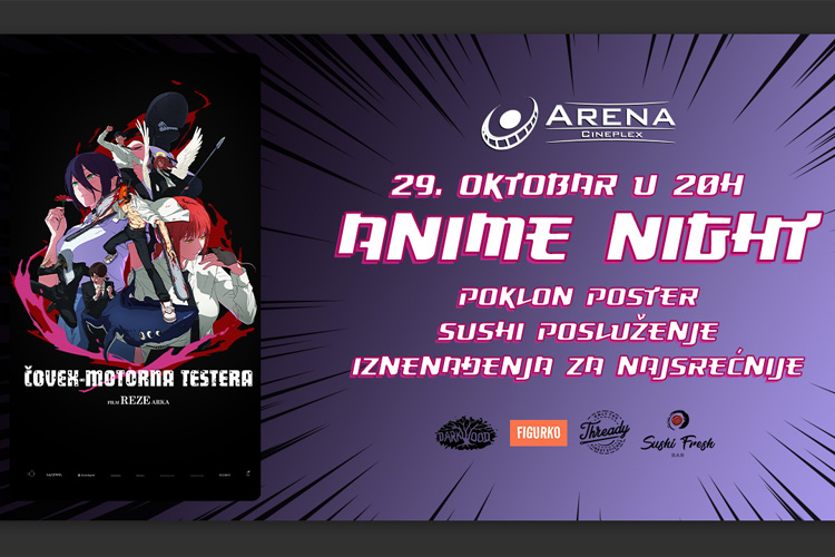Premijerno film “Čovek – Motorna testera: Film Reze Arka” stiže na Anime Night događaj 29. oktobra od 20 časova u Areni Cineplex. Veliko interesovanje anime fanova vlada od momenta puštanja ulaznica u prodaju, a publiku će, pored ovog popularnog naslova, dočekati i suši posluženje i pokloni. Ulaznice su u prodaji na blagajni!