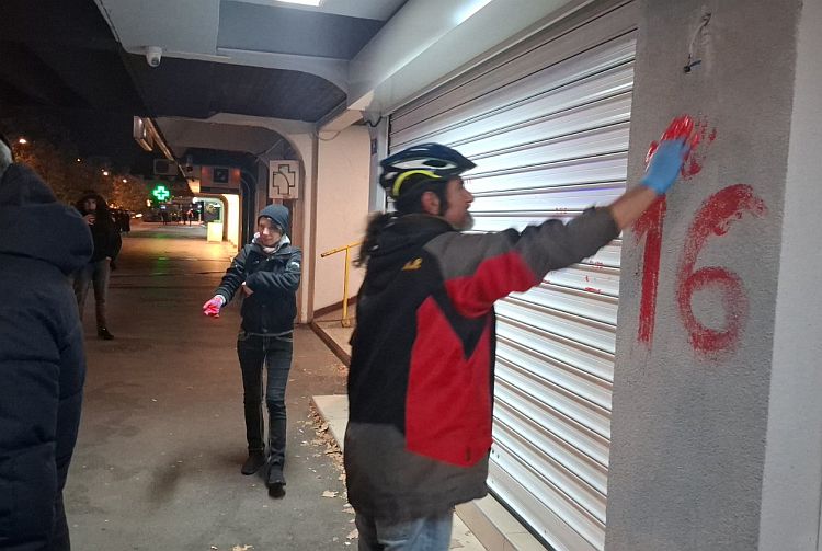 Kada su došli do prostorija Srpske napredne stranke, šakama umočenim u crvenu farbu ostavili su tragove na metalnoj roletni, ispisan je i broj 16, a na pločniku ispred – “Miloš ološ”. Crvenim šakama “oslikali” su i kante za đubre koje se nalaze prekoputa lokala.