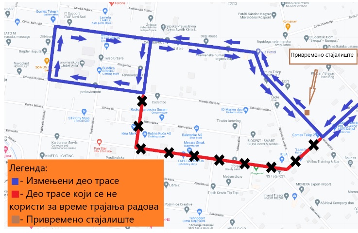U toku izmene trase privremeno stajalište nalaziće se u Mornarskoj ulici, nakon skretanja iz Ulice Heroja Pinkija, a NEĆE biti u funkciji stajalište Feješ Klare/ Ćirila i Metodija.